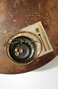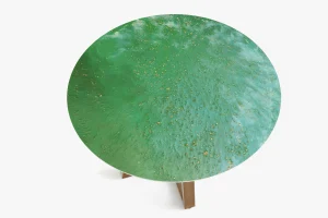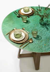 Is it still a table or already a painting? – this is how one can describe the feelings that the guests of the art exhibition and auction at the gallery on Mysia Street in Warsaw had. Ms. Ewa Mierzejewska – curator of the exhibition – invited Monika Blaszkowska and her Migaloo Home to premiere two of her tables at the opening. One table was made of walnut shell and featured metallic accessories and copper accents, while the other was emerald with gold flakes.