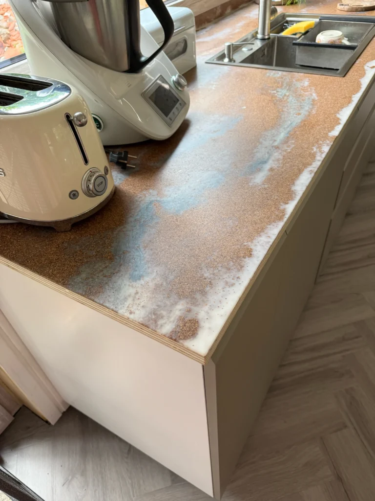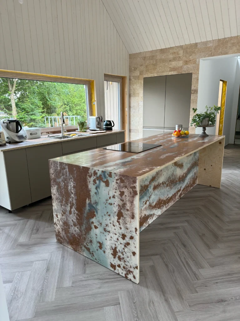 The kitchen island and countertop installation was crafted from a composite made of crushed walnut shells and a binder in a color chosen by the client. The organic nature of the material is emphasized by a hand-laid pattern created in the studio. The colors harmonize with the living room’s color palette.