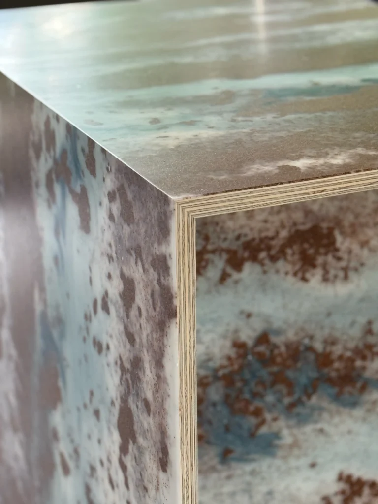 The surface is non-absorbent, resistant to discoloration from food juices and alcohol, and can be renewed multiple times by lightly sanding it with fine sandpaper.