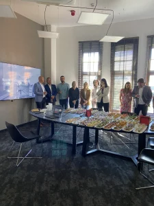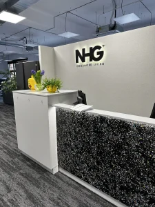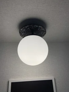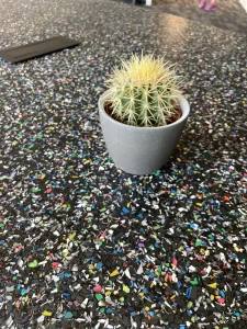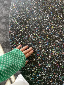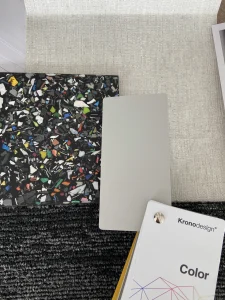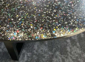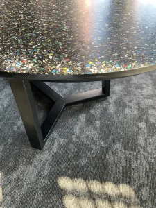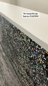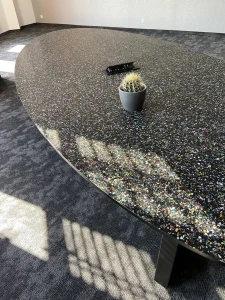 The headquarters of Danish company NHG, which produces plastic packaging, and its latest product line is made from recycled plastic. The choice of a furniture board that shows ground PET waste dipped in matte black resin was very natural here. Migaloo home with its story conquered the image of its customer focused on promoting so-called good plastic. The conference table was made in two parts – after bringing the elements to the 3rd floor – the whole thing was assembled already in the room. The final table top was about 5 m long and 1.4 wide, finished with natural wood oil. The same board was used for the reception desk decor and the elements decorating the lamps.The project was made by the studio: Moka Design.