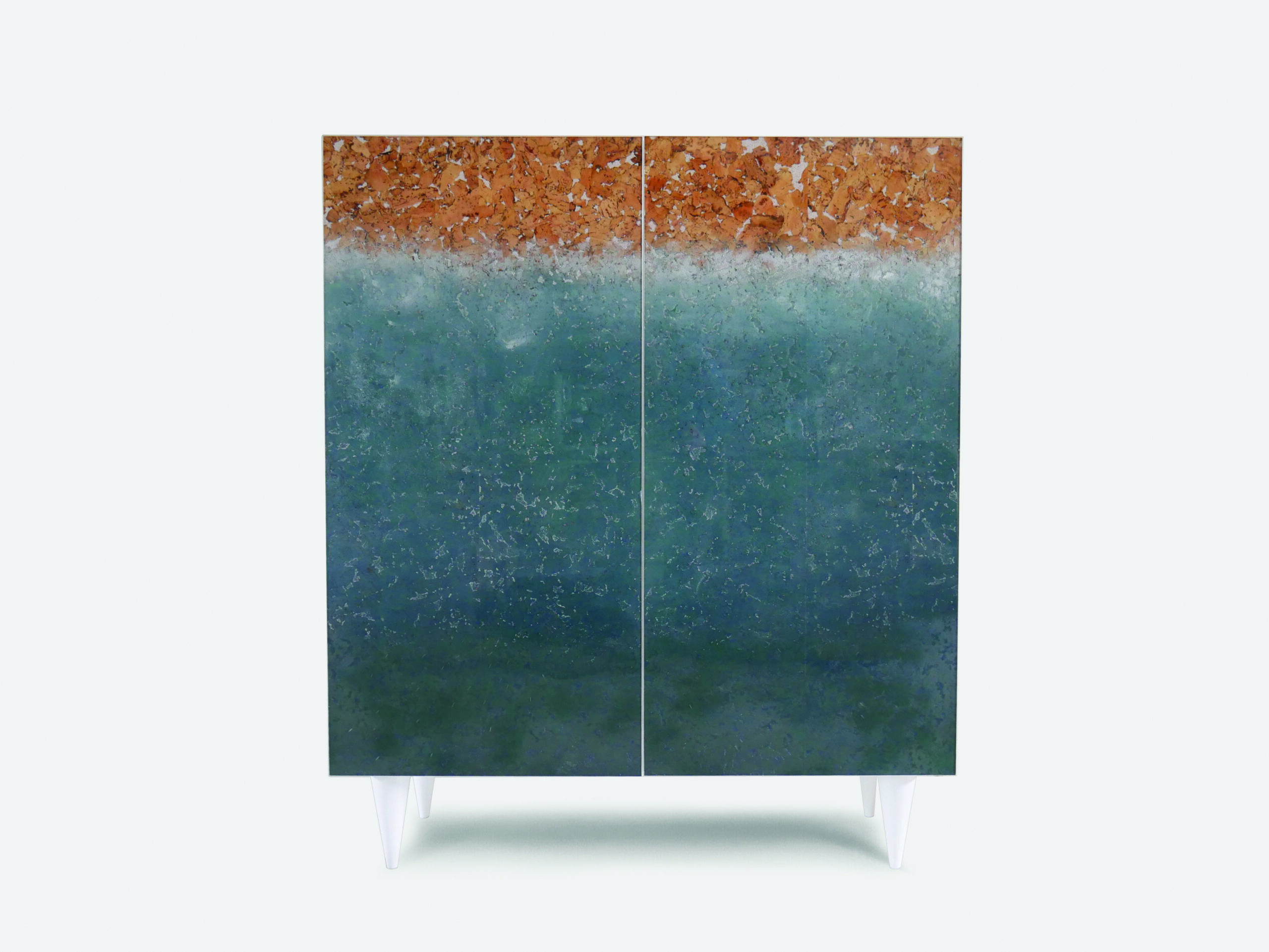 The wardrobe is made of an in-house developed material called migaloo rock, a conglomerate made of natural cork and resin. The body and front edges are black mdf with high gloss finish. Natural cork has been hand-decorated by artist Monika Błaszkowska and then secured with a 4-milimiter layer of epoxy resin and special varnishes resistant to scratches and UV rays.