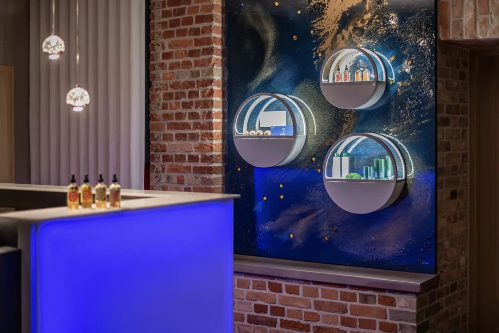 Wnętrze Spa Hevelia nie jest jedynie miejscem zabiegów – to doświadczenie sensoryczne. Delikatne światło, refleksy złota, organiczna struktura bursztynu i kosmiczna kolorystyka tworzą przestrzeń sprzyjającą regeneracji ciała i umysłu.
