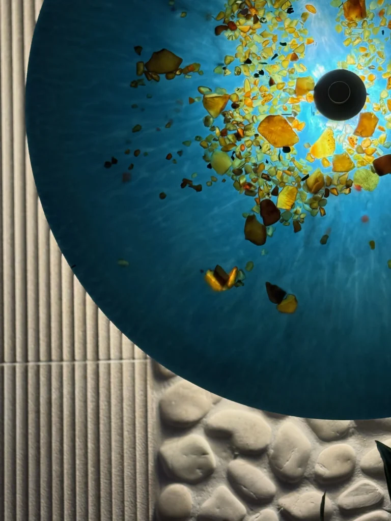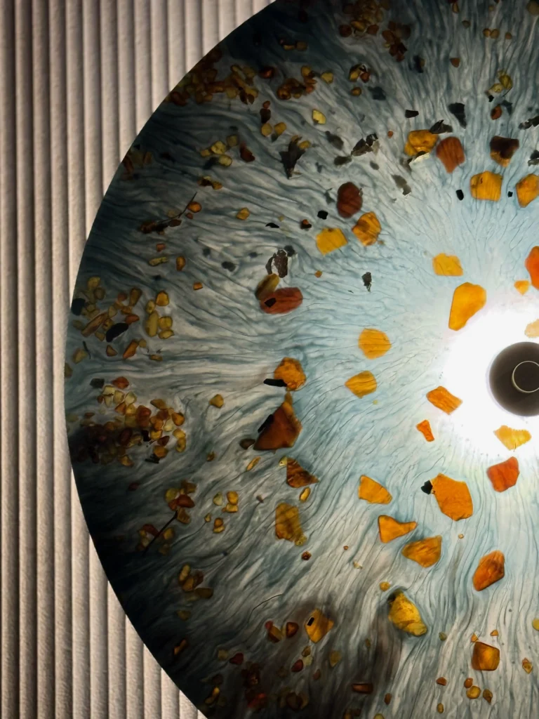 Każdy z tych elementów stanowi unikatowe dzieło sztuki użytkowej. W strukturze paneli punktowo podświetlono naturalny bursztyn bałtycki, który niczym gwiezdny pył rozświetla przestrzeń ciepłym, złotym blaskiem.