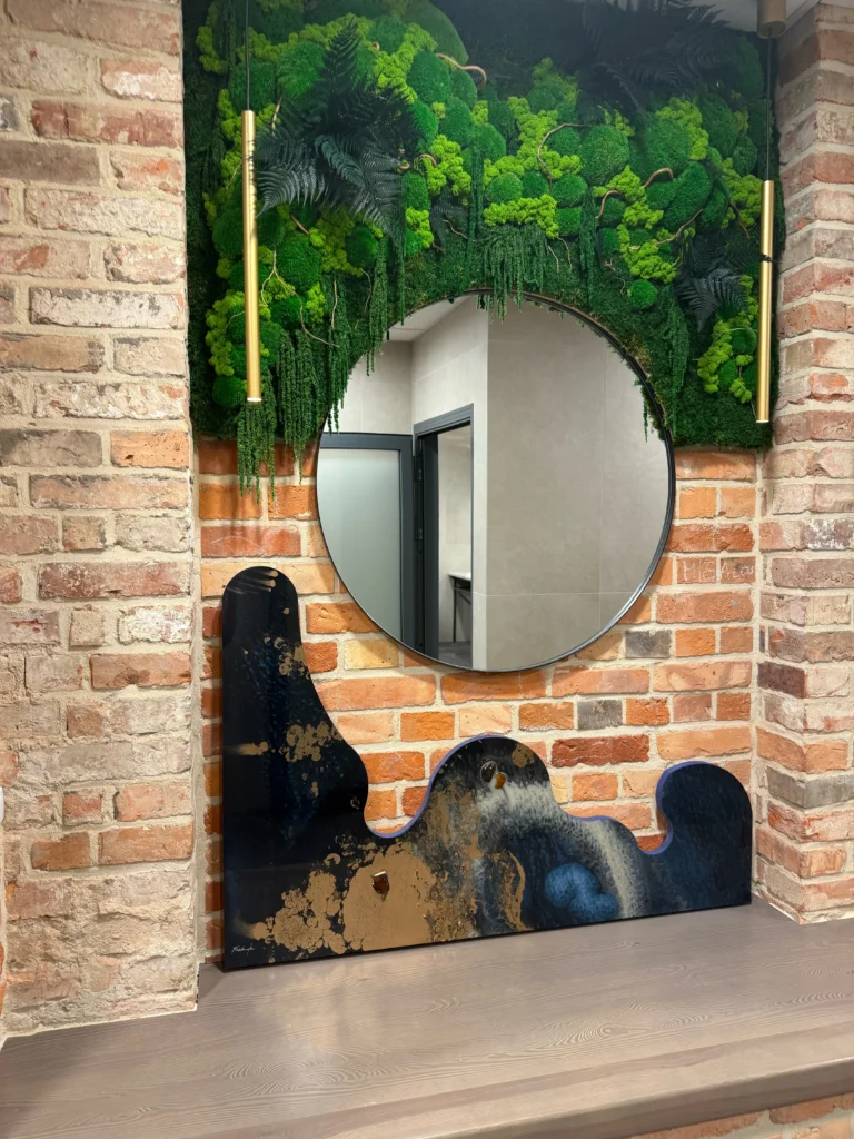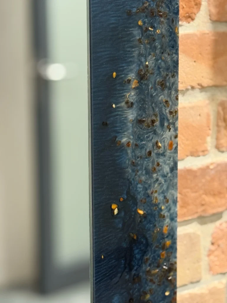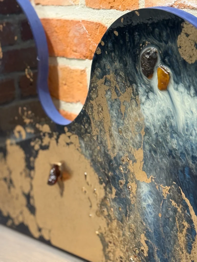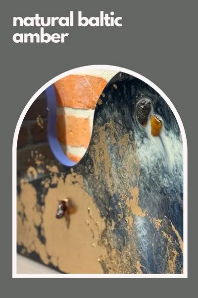 Najbardziej charakterystycznym elementem aranżacji są oryginalne artystyczne  płyty meblowe z bursztynem, zaprojektowane i wykonane przez Migaloo Home. Zostały one wykorzystane jako: